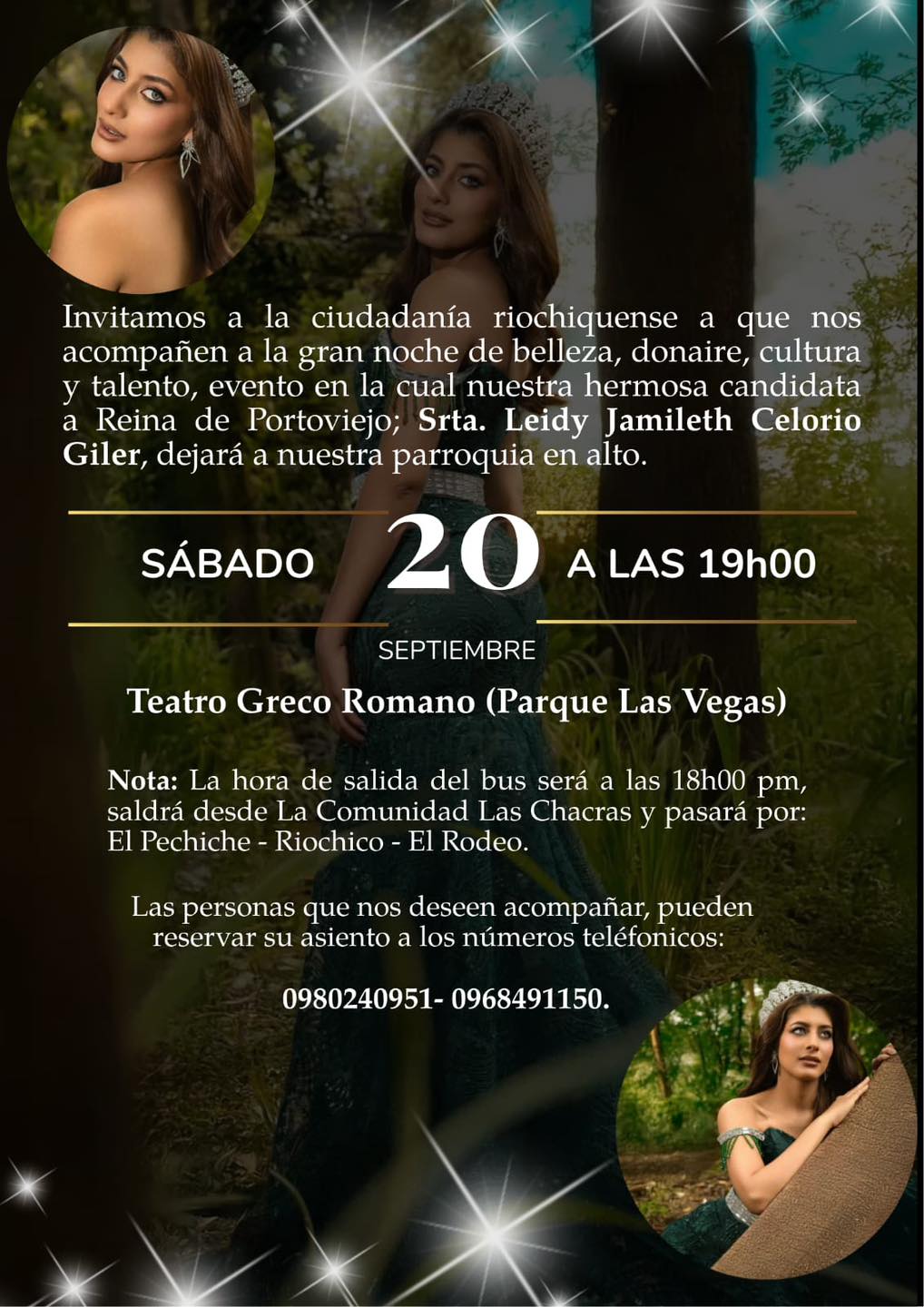 Invitamos con orgullo a toda nuestra ciudadanía a respaldar a nuestra hermosa representante Leydi Jamileth Celorio Giler, quien con su carisma, talento y compromiso dejará el nombre de nuestra parroquia en alto en la Elección de Reina de Portoviejo 2025 – 2026.
