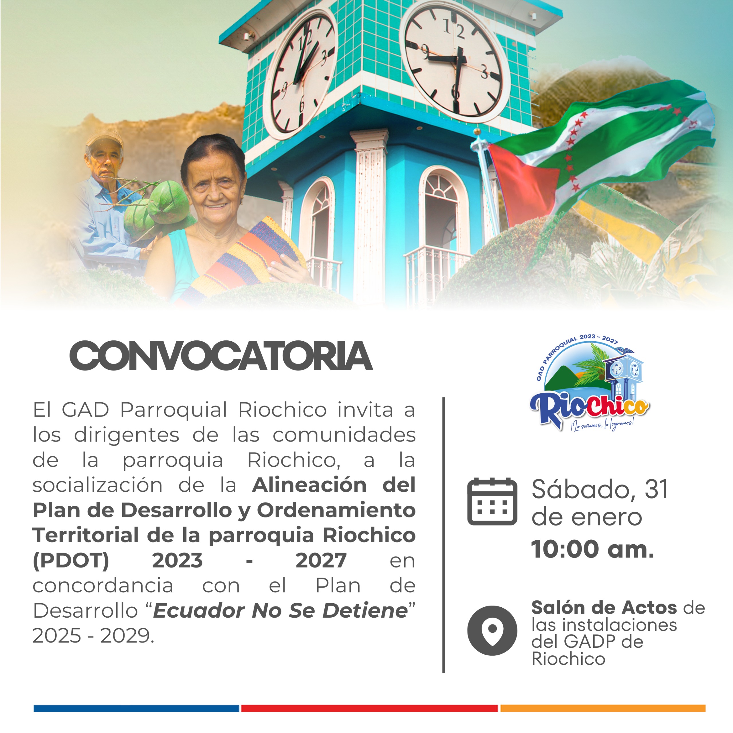 El GADP de Riochico convoca a los líderes y representantes de las comunidades de la parroquia a participar en la jornada de Socialización de la Alineación del PDOT 2023–2027.